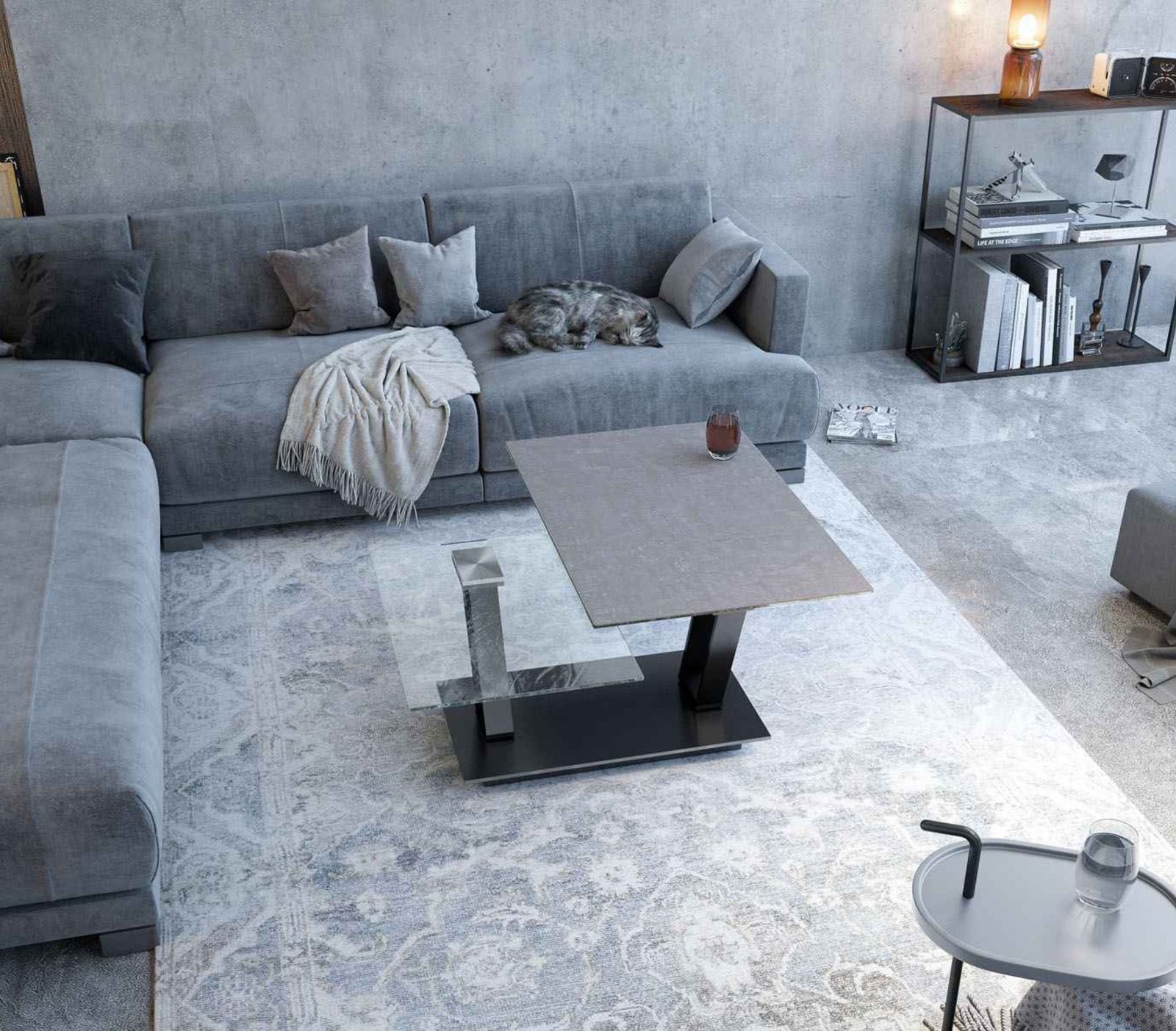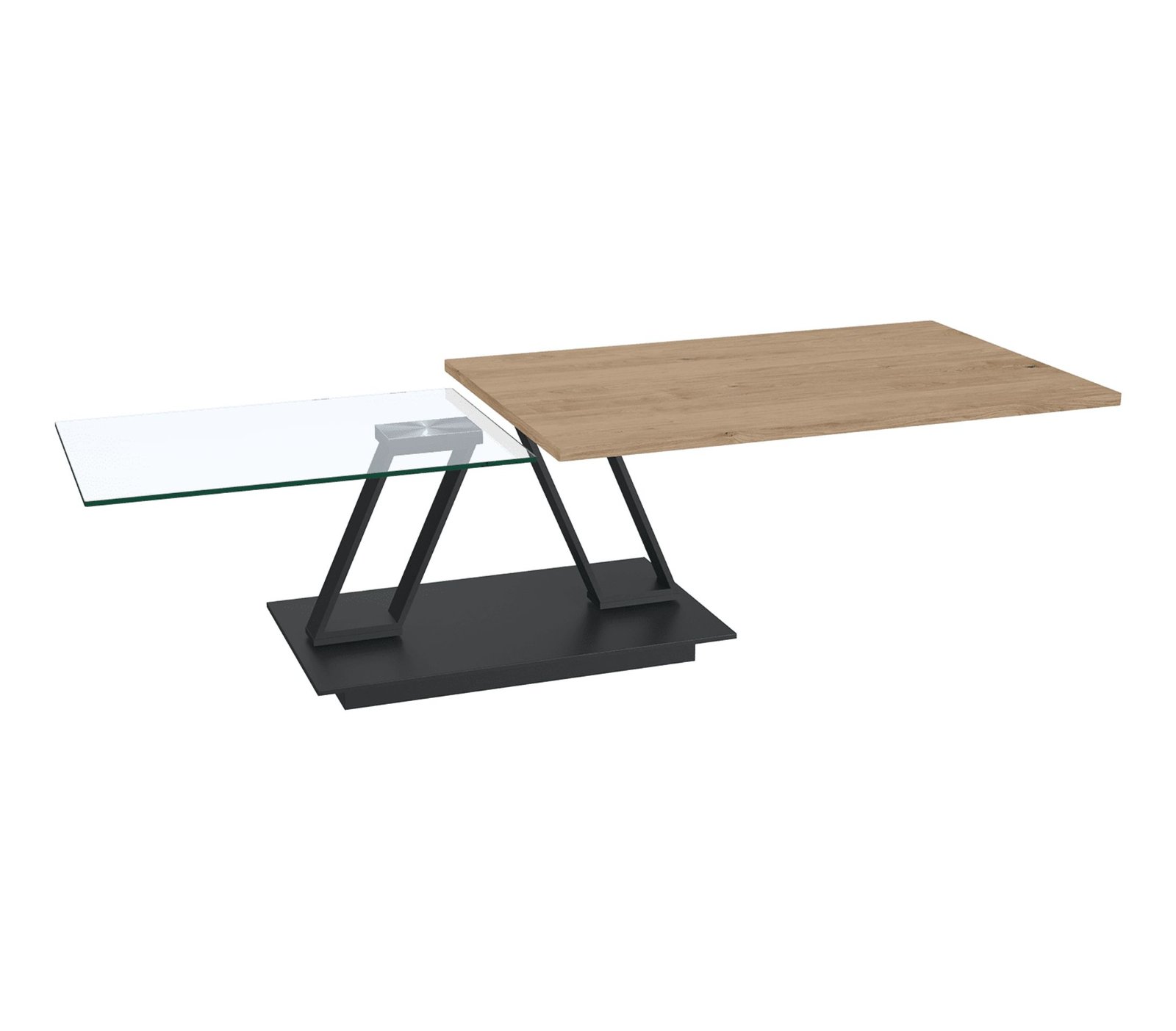 Akante išskleidžiamas kavos staliukas BARCELONA turi du stalviršius, kurie sukant keičia padėtį. Šis prabangus staliukas dėl savo elegantiškos urbanistinės išvaizdos lengvai įsilies į bet kokios svetainės interjerą. Išskleiskite dvi stalviršio plokštes, kad maksimaliai padidintumėte turimą paviršiaus plotą net iki 163 cm ilgio. Stalviršis pagamintas iš 3 mm storio keraminių plokščių, priklijuotų ant 6 mm grūdinto stiklo plokščių, kad būtų užtikrintas aukščiausias atsparumas. Matinės juodos spalvos plieninės kojos papildo vientisą ir elegantišką stalo vaizdą. Rėmo pagrindo ir transformavimosi funkcijos dėka, kavos staliukas BARCELONA atrodo lengvai ir įmantriai, o tvirtas lakuoto plieno pagrindas užtikrina staliuko stabilumą. Gali būti su ratukais arba be.