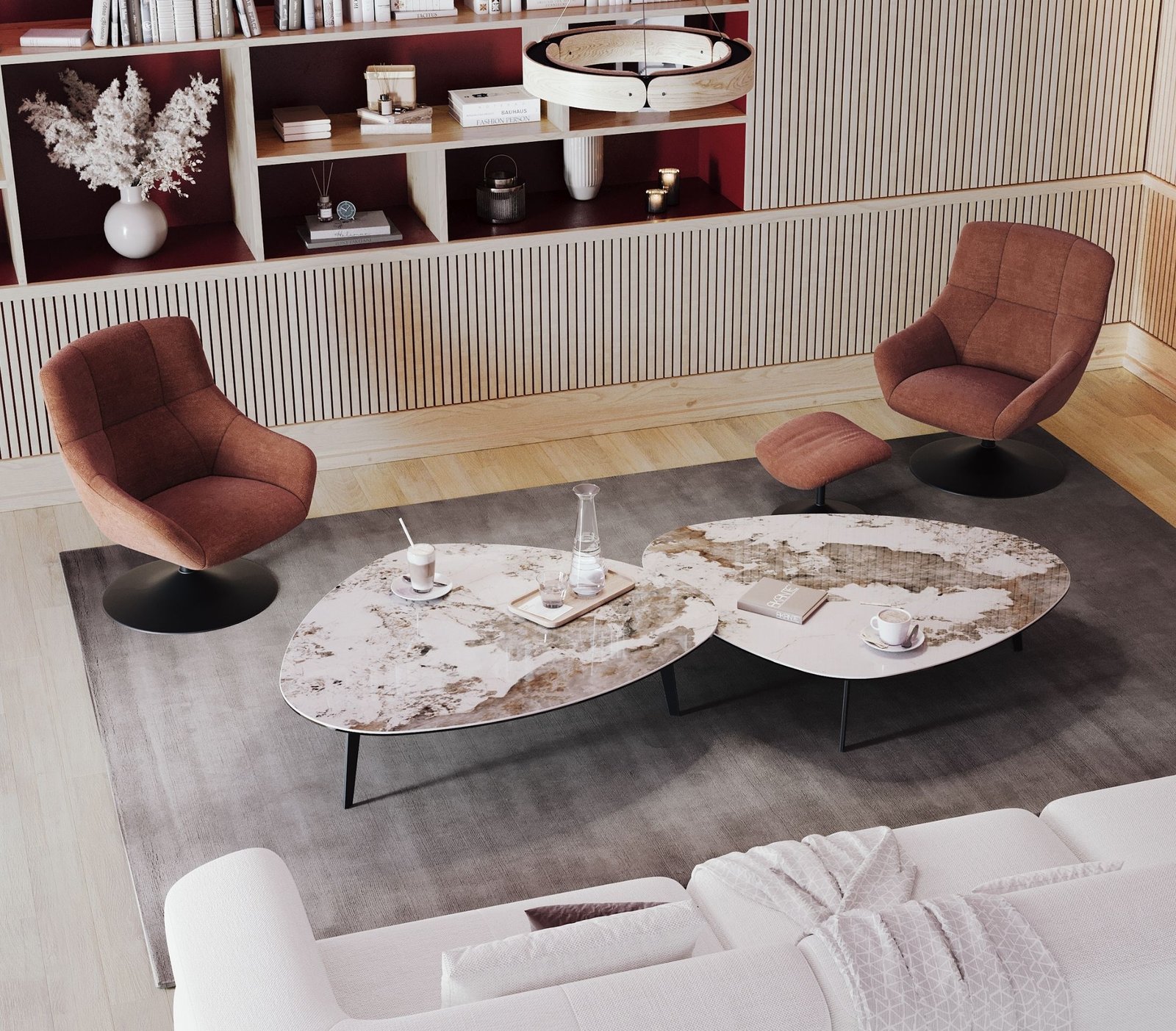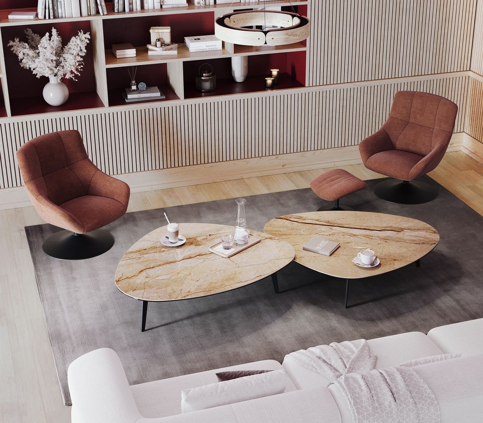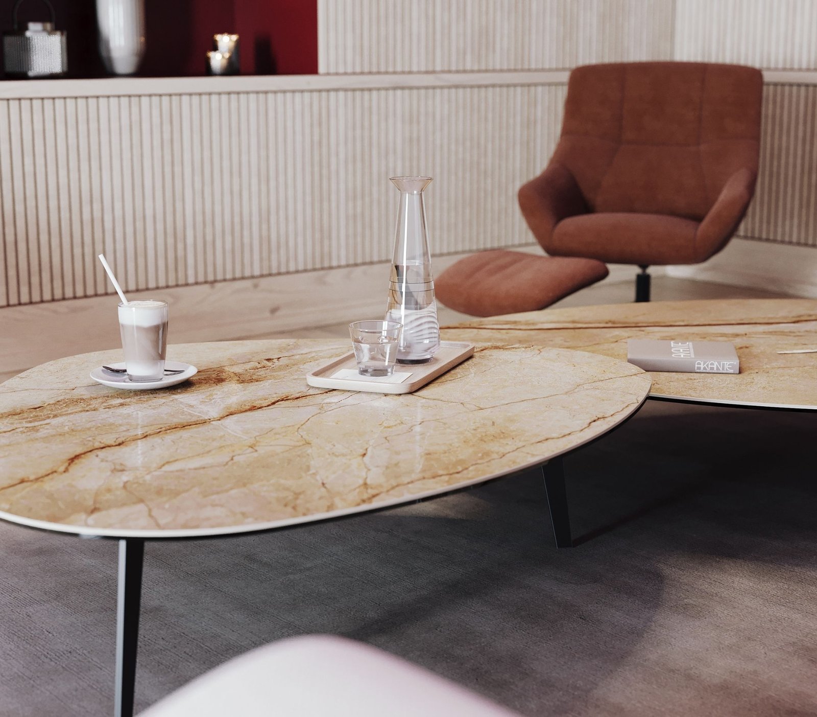 Naujausias šiuolaikinės kolekcijos papildymas yra Akante kavos staliukas GALET.