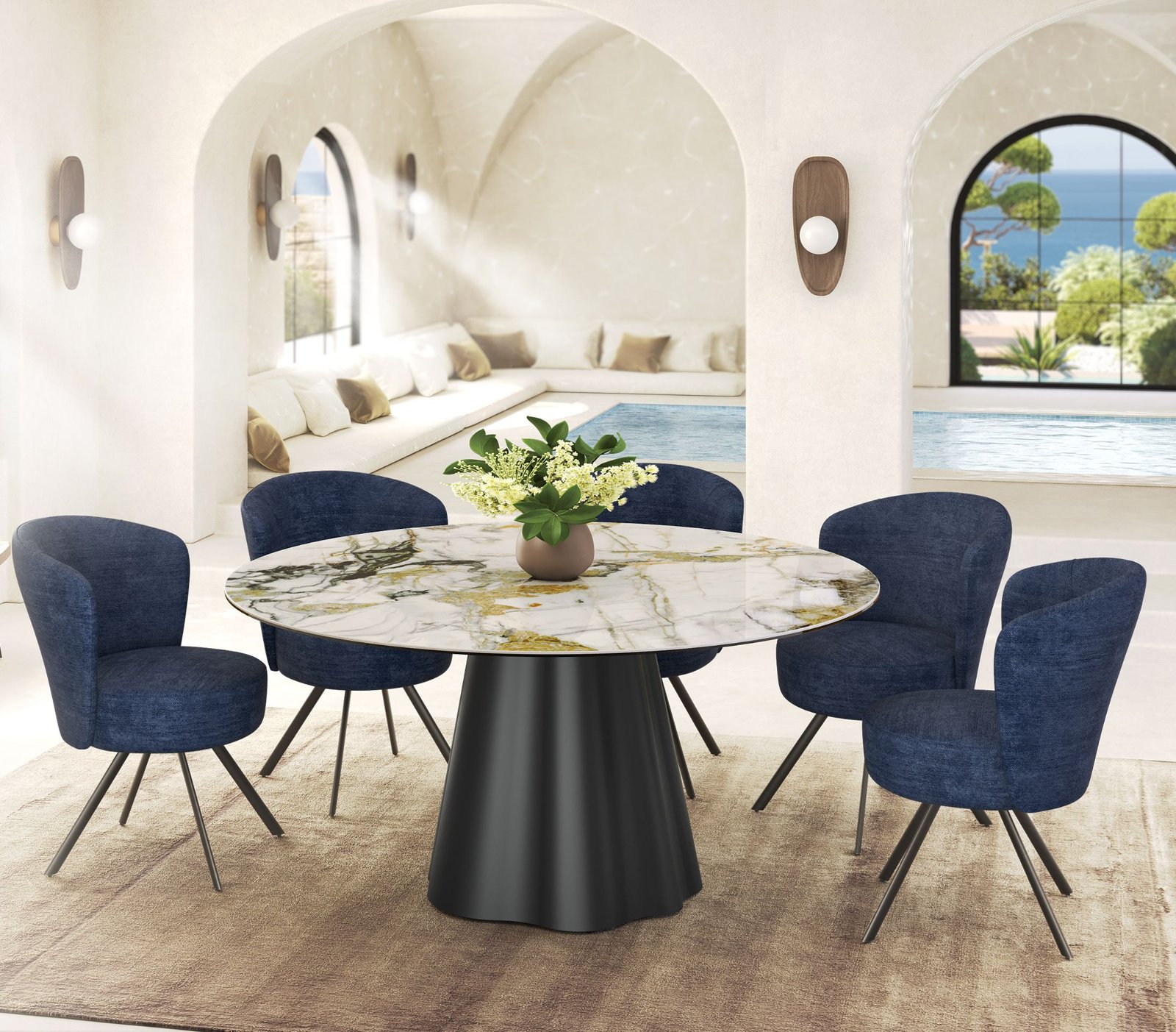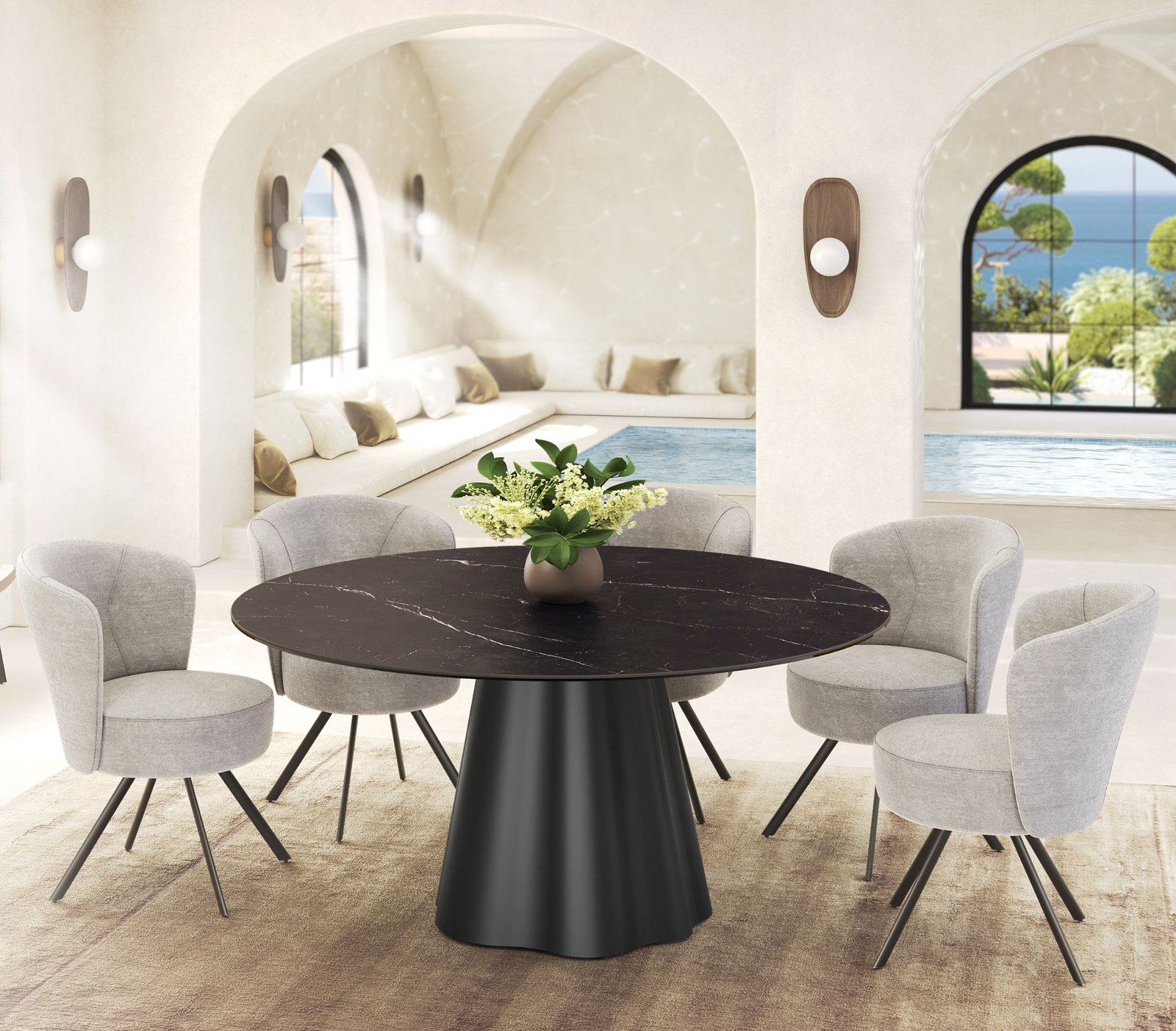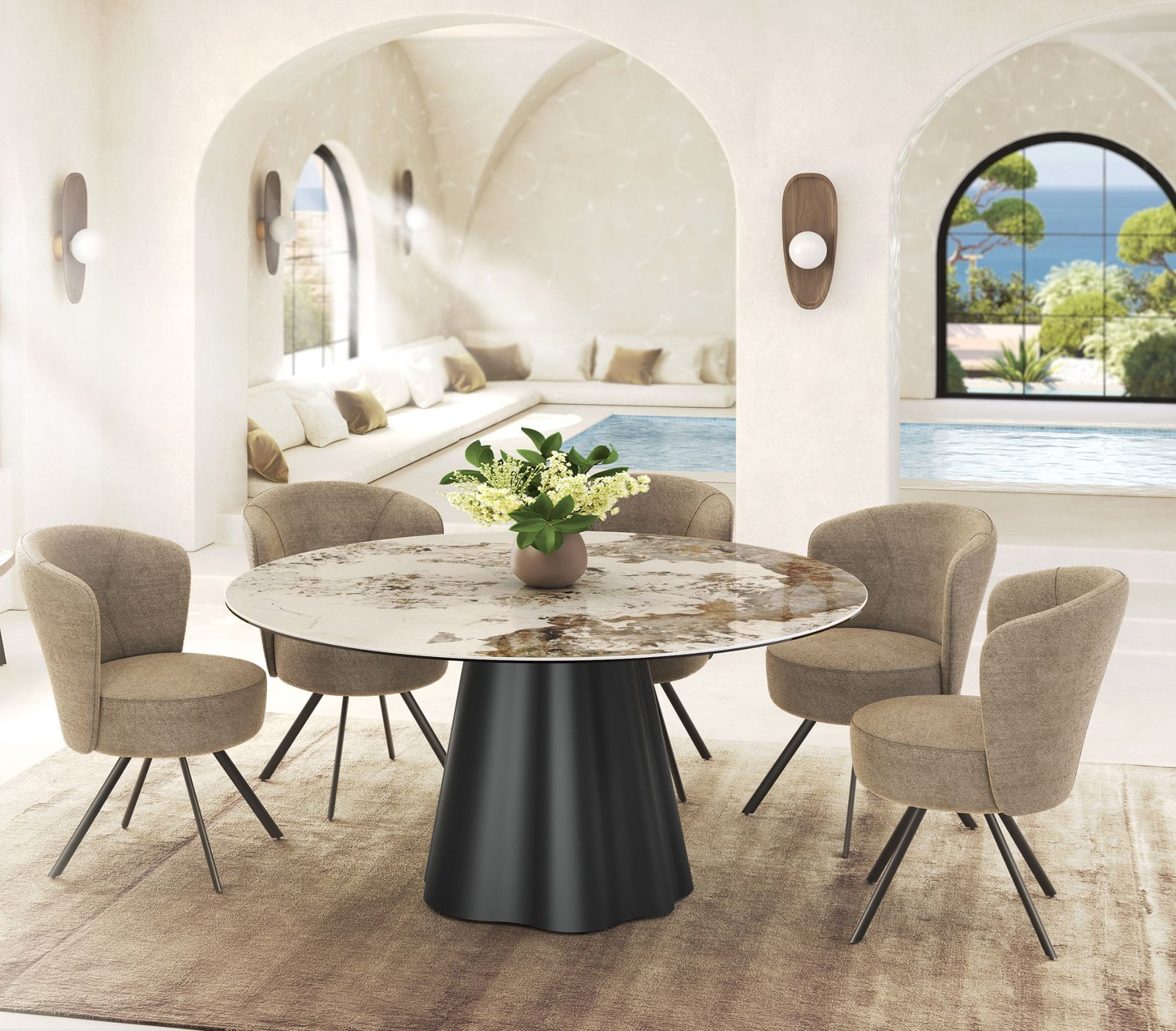 Akante Valgomojo stalas AUGUSTE – 160 cm skersmens ir išskirtinio dizaino stalas. Galimas keturių spalvų stalviršio keramikos pasirinkimas. Stalas pakankamai didelis, tad aplinkui susėsti galės ir didesnė kompanija žmonių.