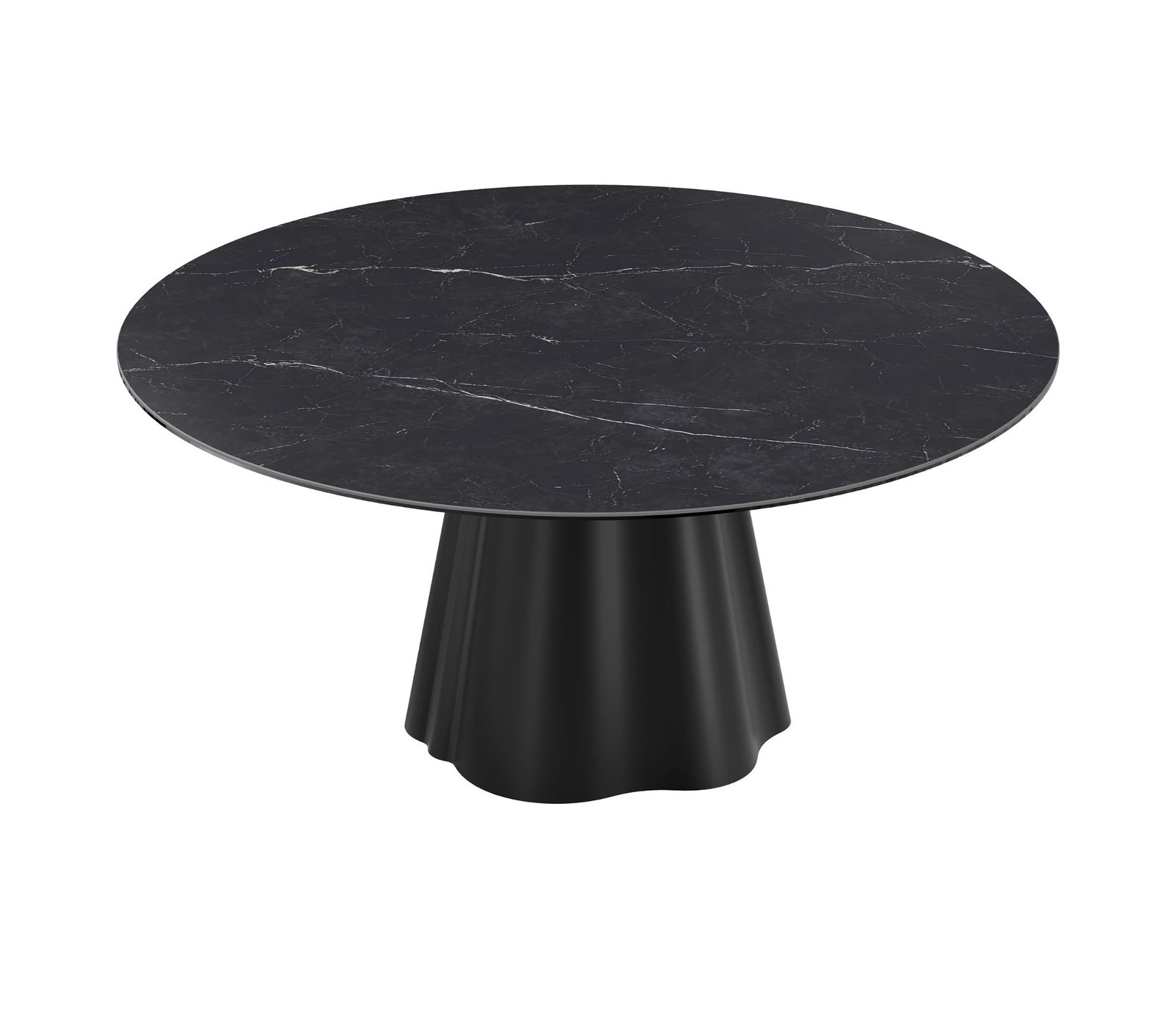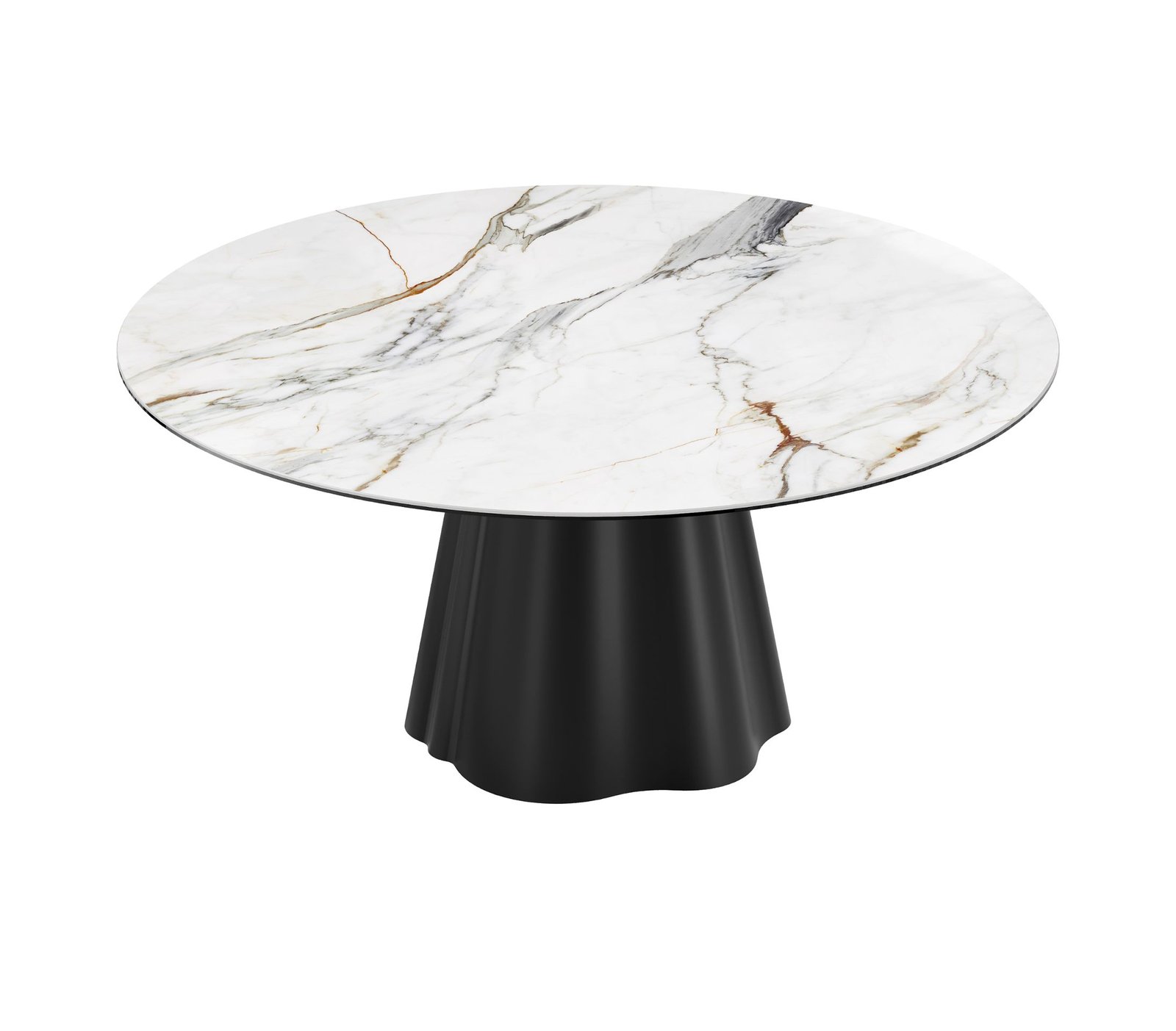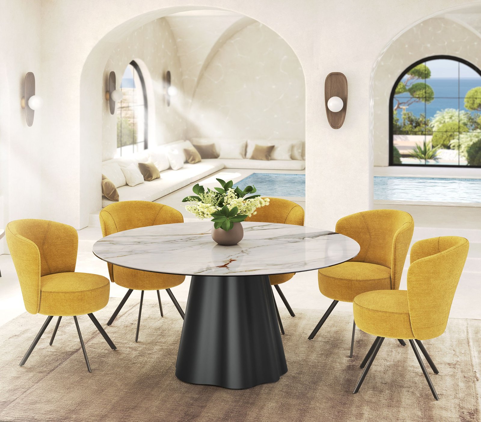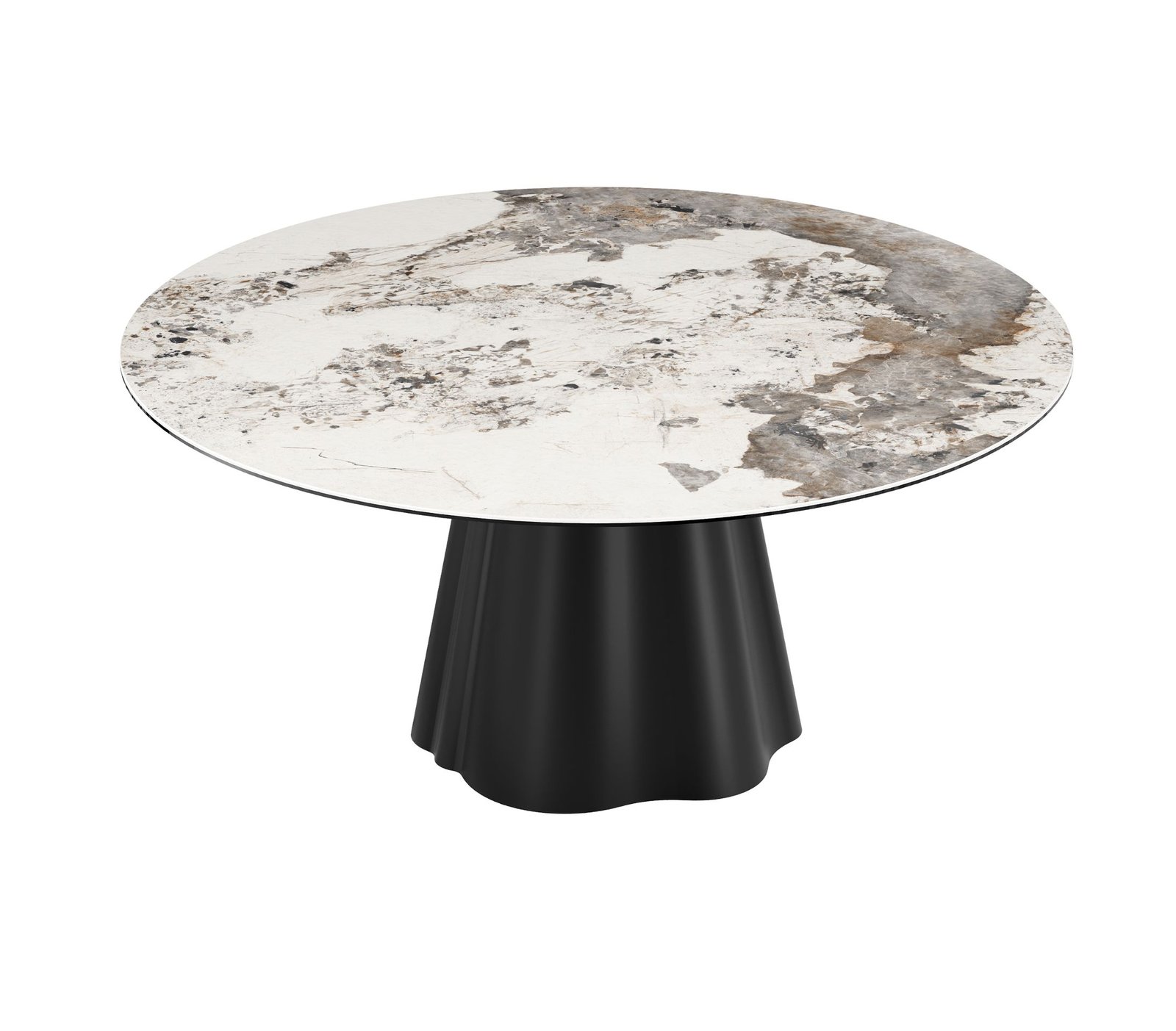 Akante Valgomojo stalas AUGUSTE – 160 cm skersmens ir išskirtinio dizaino stalas. Galimas keturių spalvų stalviršio keramikos pasirinkimas. Stalas pakankamai didelis, tad aplinkui susėsti galės ir didesnė kompanija žmonių.