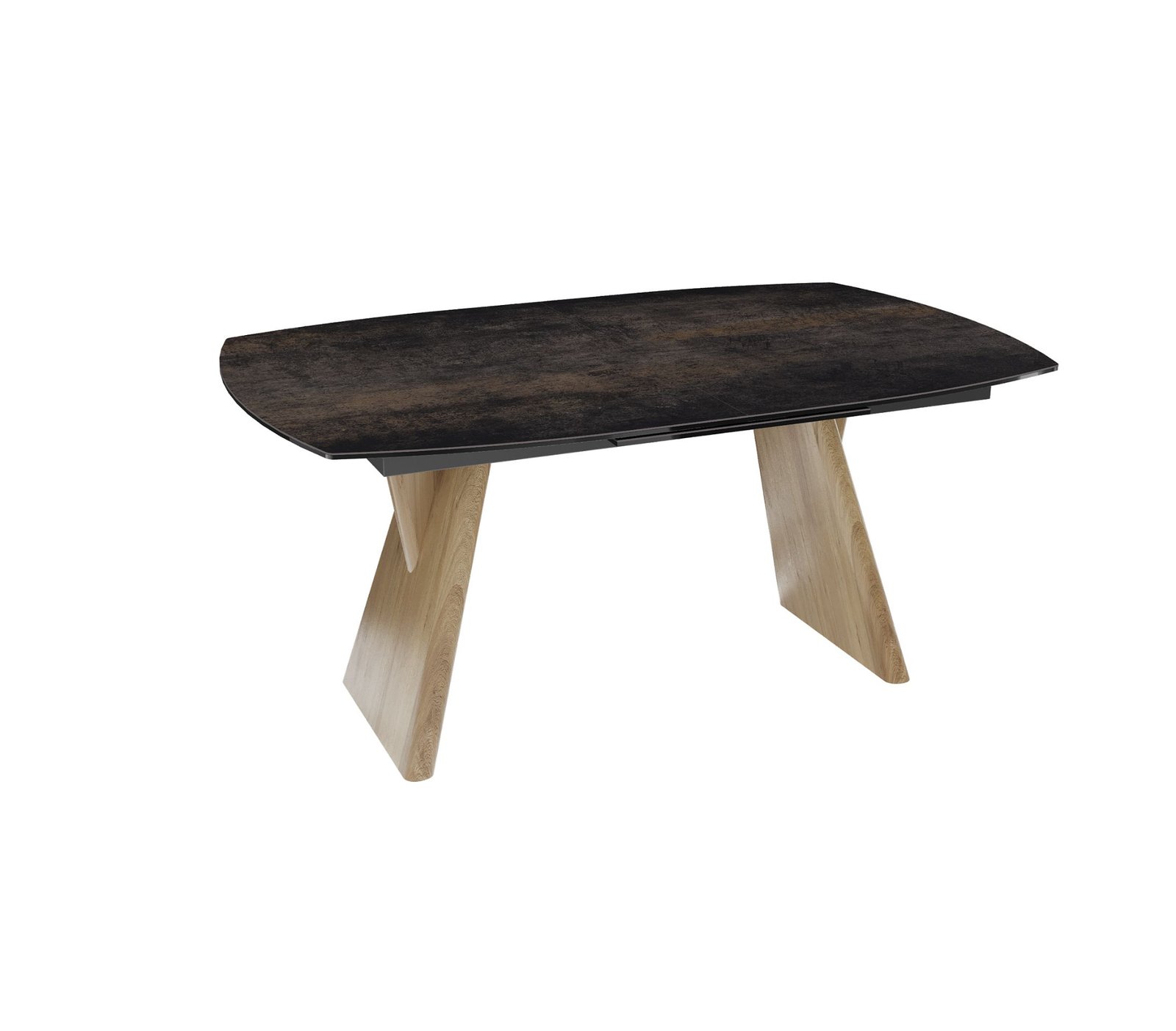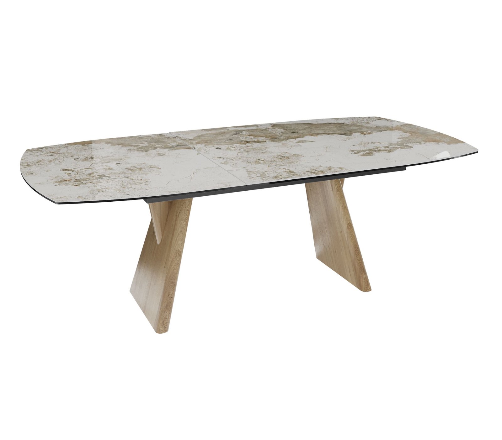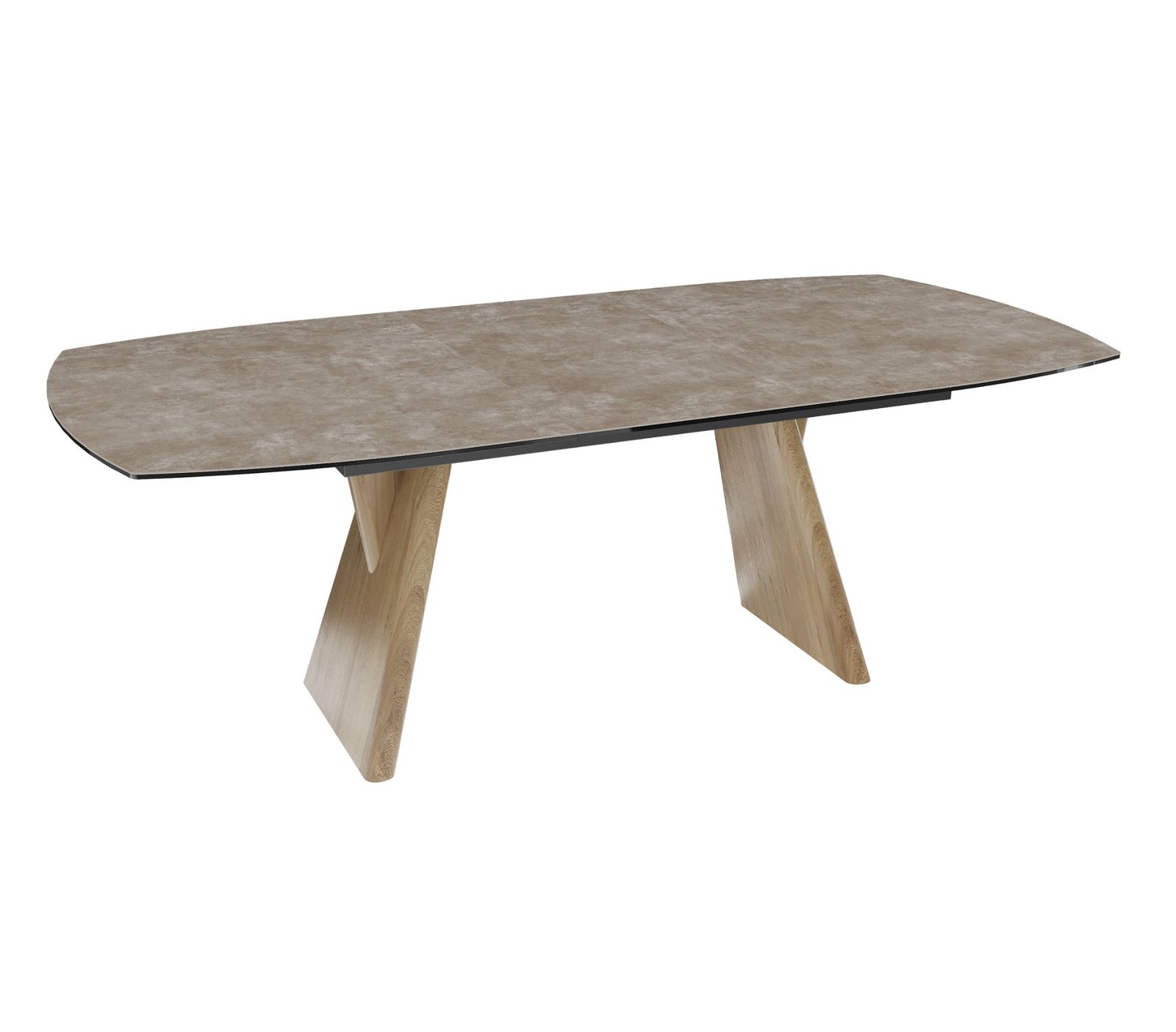 Keraminis pasirinktos spalvos ir rašto stalviršis suteikia prabangos pojūtį ir vizualinį gylį. Jis atrodo estetiškai, be to yra lengvai prižiūrimas. Stalo kojos pagamintos iš tvirto kietmedžio ir dengtos natūraliu ąžuolo lukštu, kuris subtiliai atskleidžia medžio tekstūros grožį. Šis derinys užtikrina ilgaamžiškumą, stabilumą ir suteikia baldui šiltą, natūralų charakterį bei architektūrišką konstrukciją.