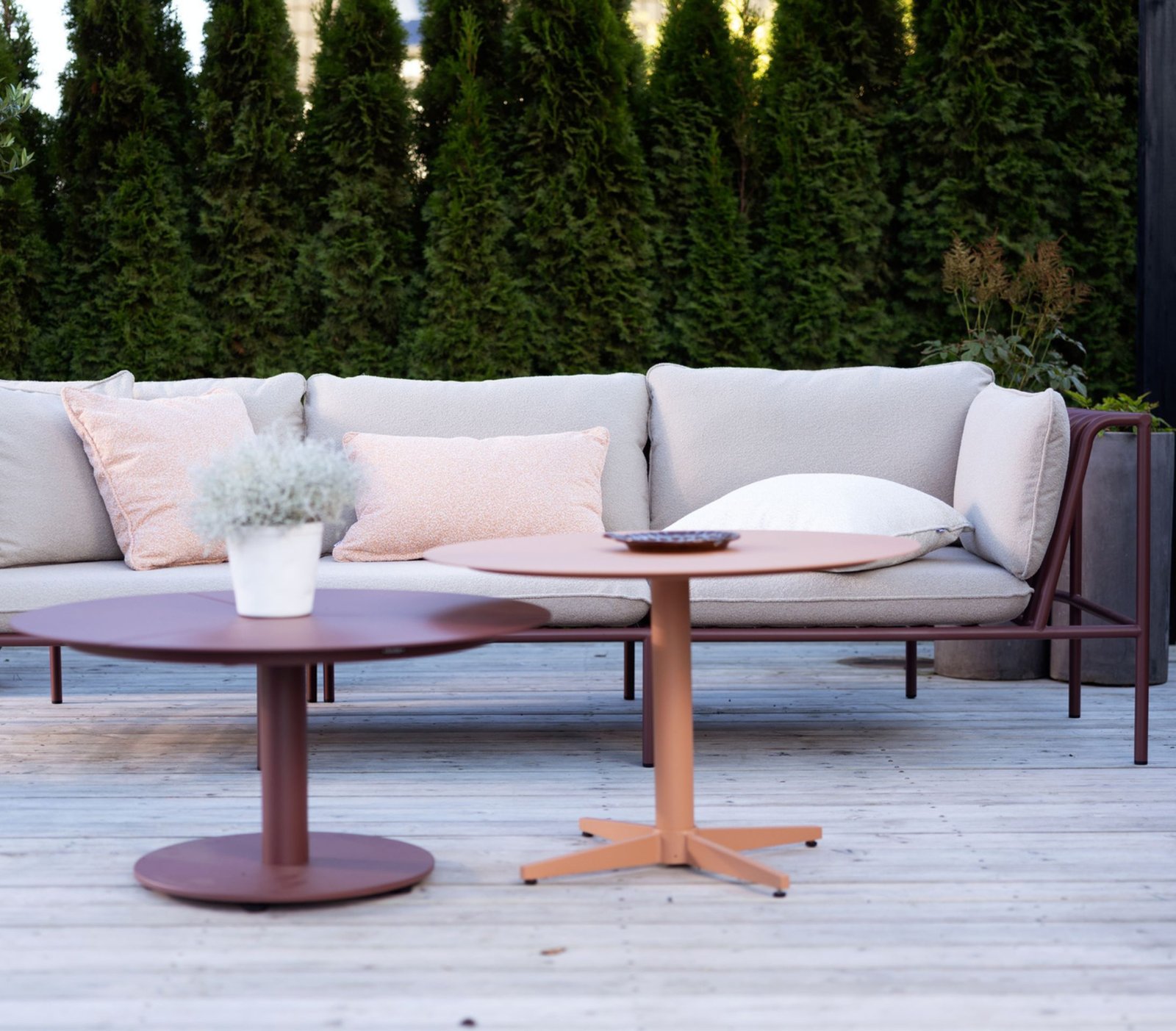 PEACE kolekciją papildė kavos staliukų serija. Šis lauko kavos staliukas PEACE derina minkštas formas su tvirta konstrukcija ir tampa modernia bei stilinga Jūsų terasos detale. Milteliniu būdu dažytas aliuminio staliukas su ikoniniu „Peace“ stalviršio raštu pasižymi elegantiškomis linijomis, kurios gražiai kontrastuoja su apvalia forma. Galimos penkios spalvos ir du aukščiai, tad staliukai puikiai gali būti derinami tarpusavyje, sukuriant nesenstančią ir harmoningą išvaizdą.