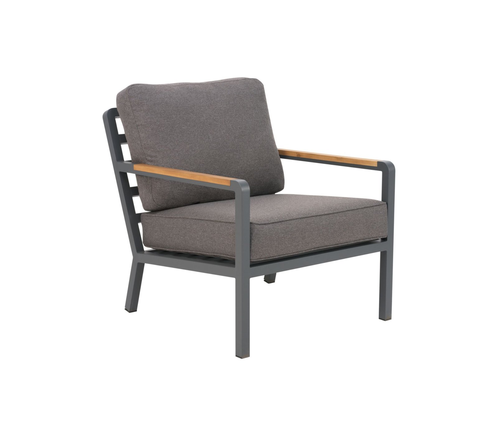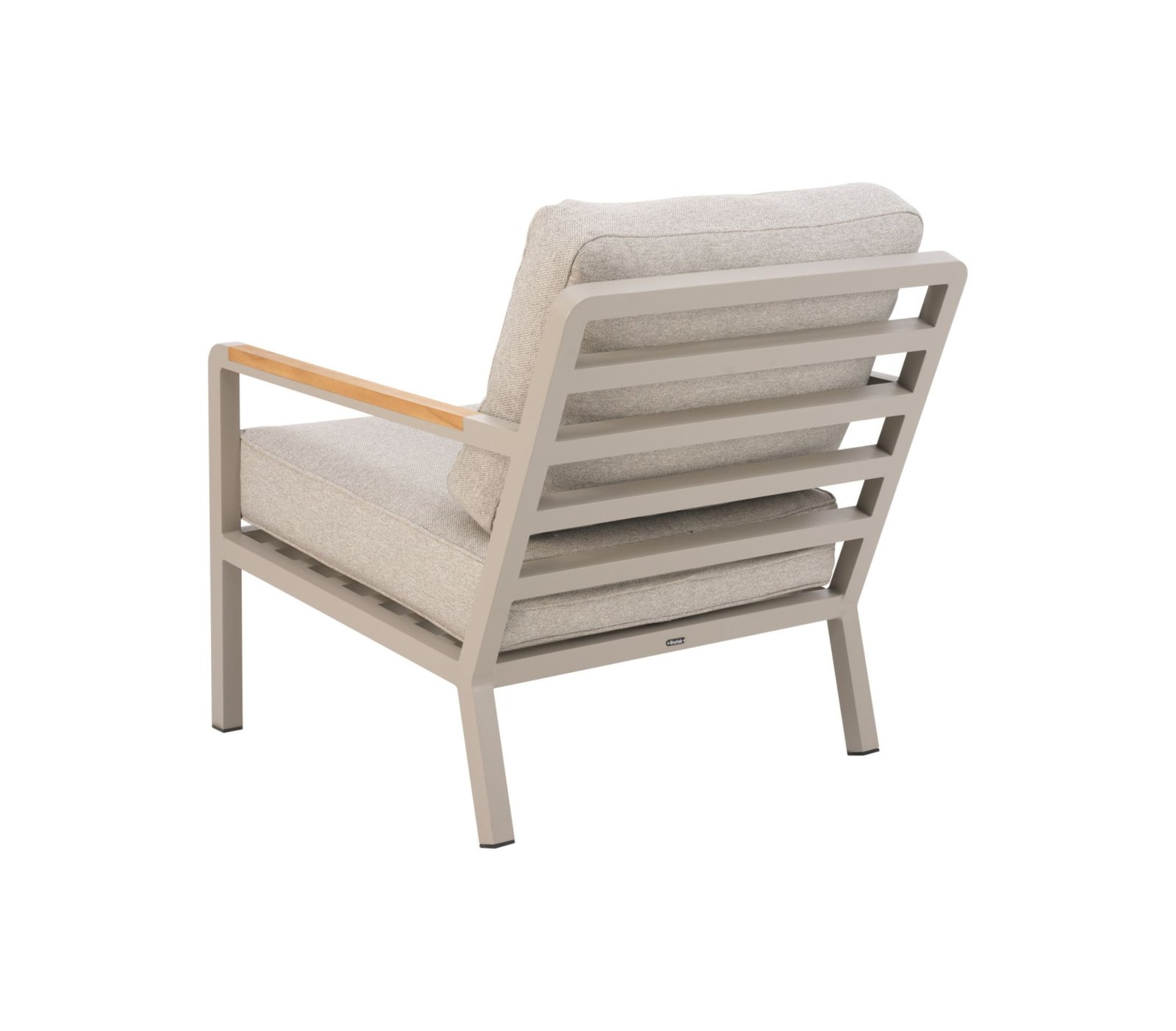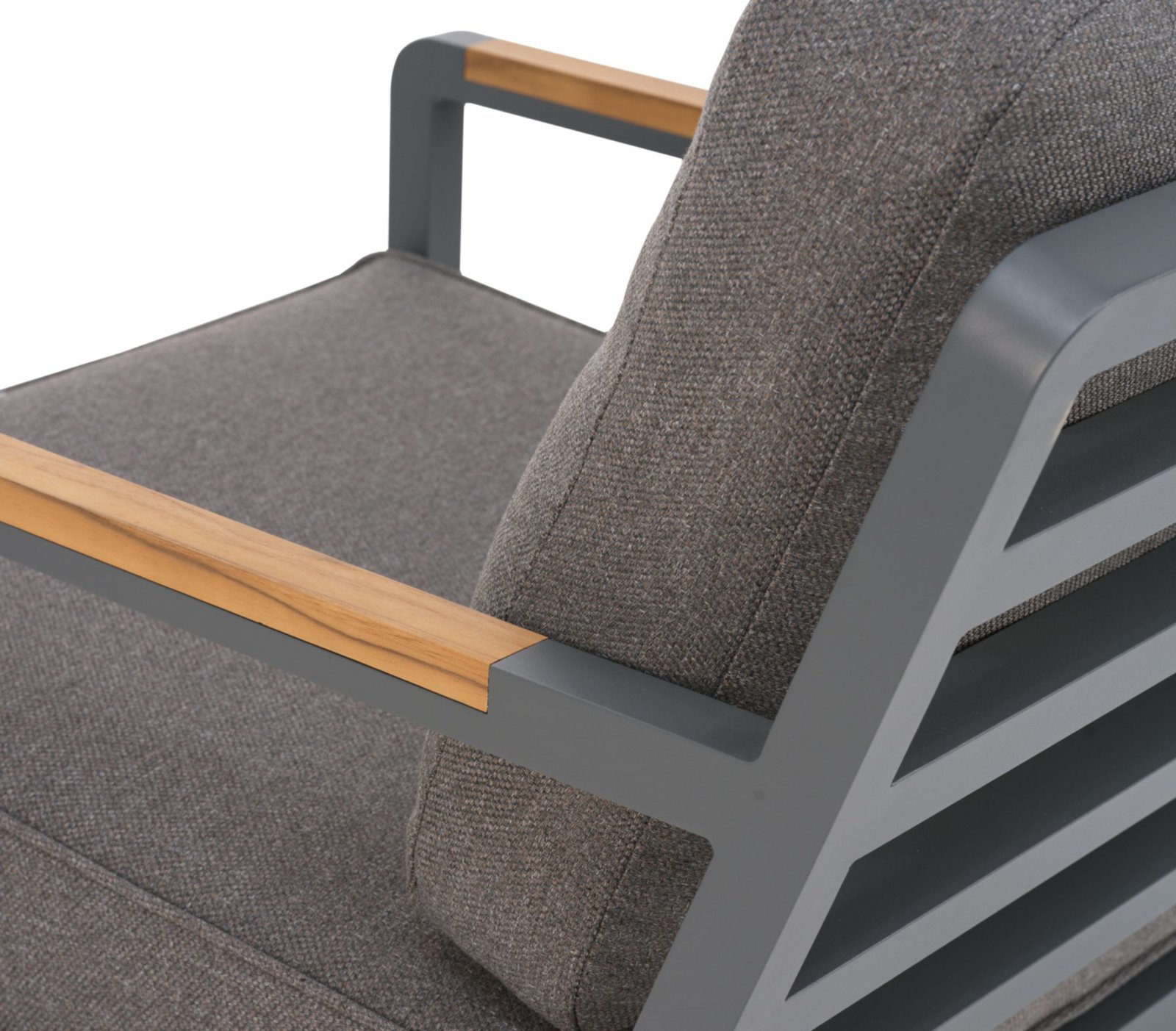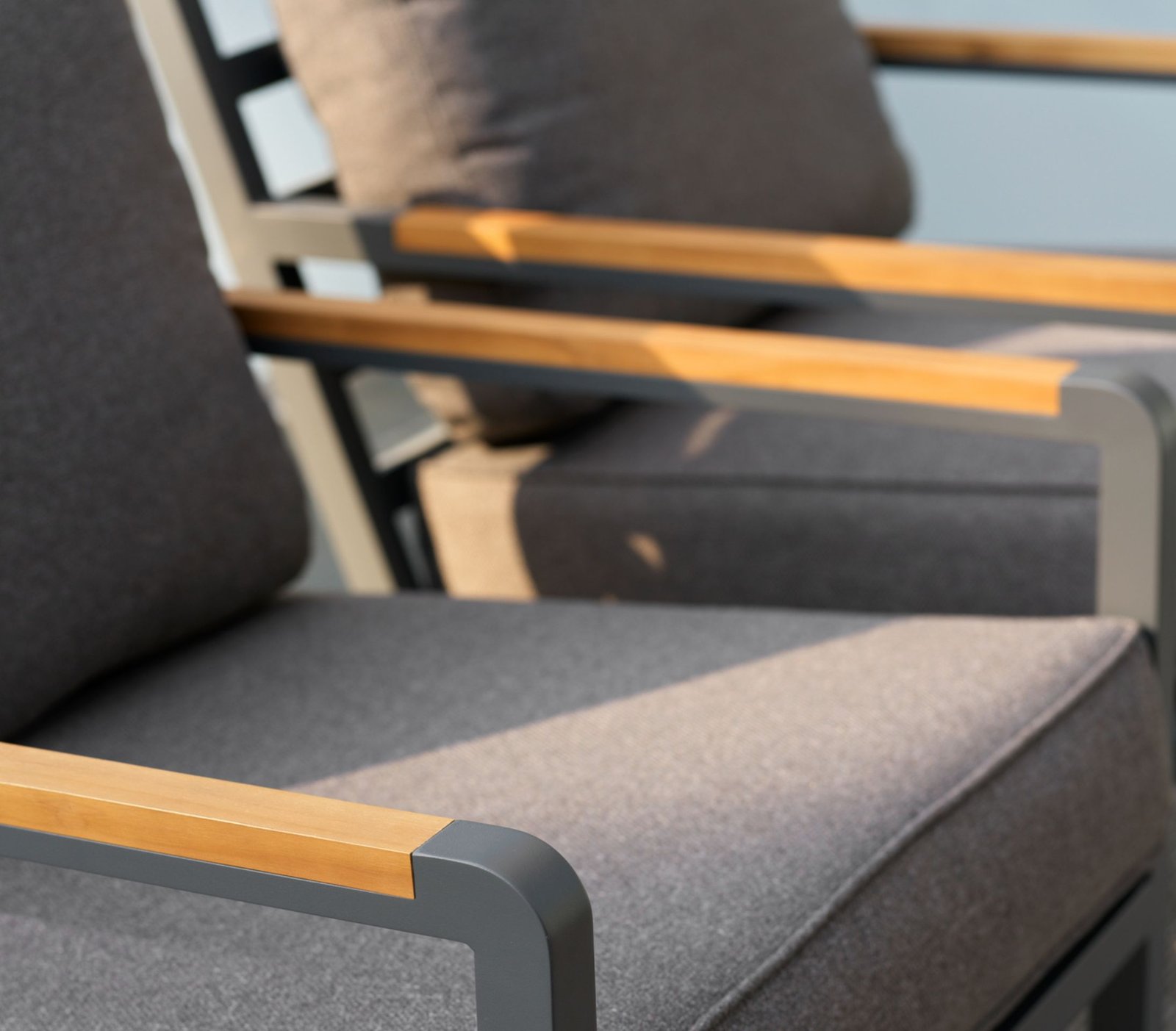 Tvirtas aliuminio rėmas kartu su natūralaus tikmedžio porankiais sukuria elegantišką kontrastą ir suteikia baldams šilumos bei išskirtinumo.
