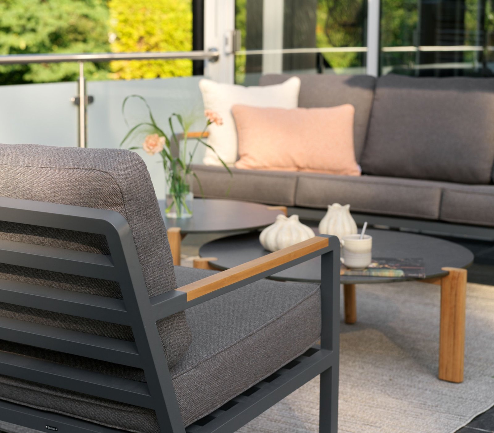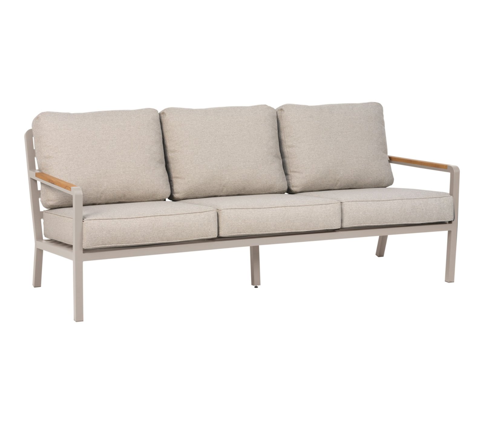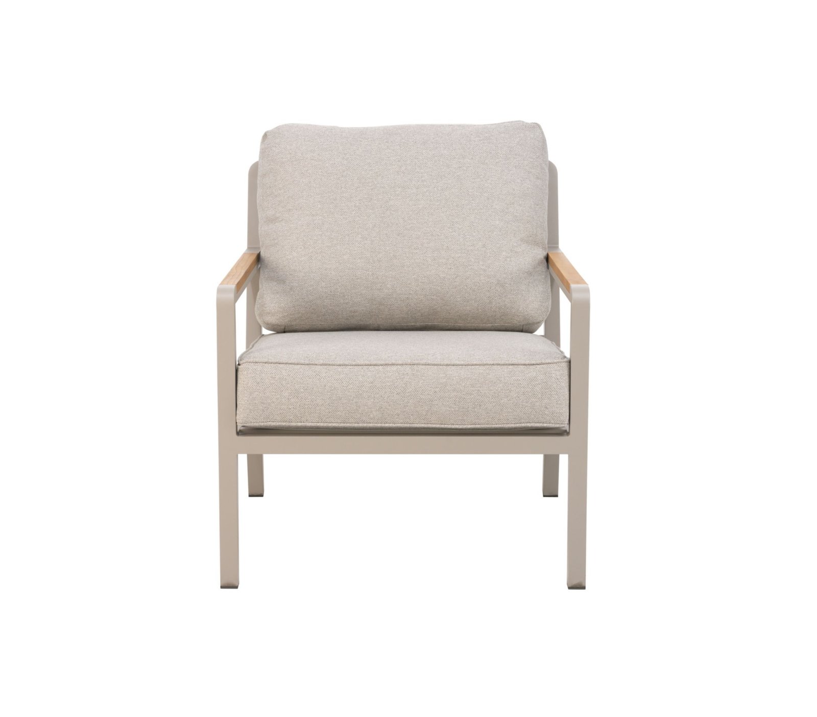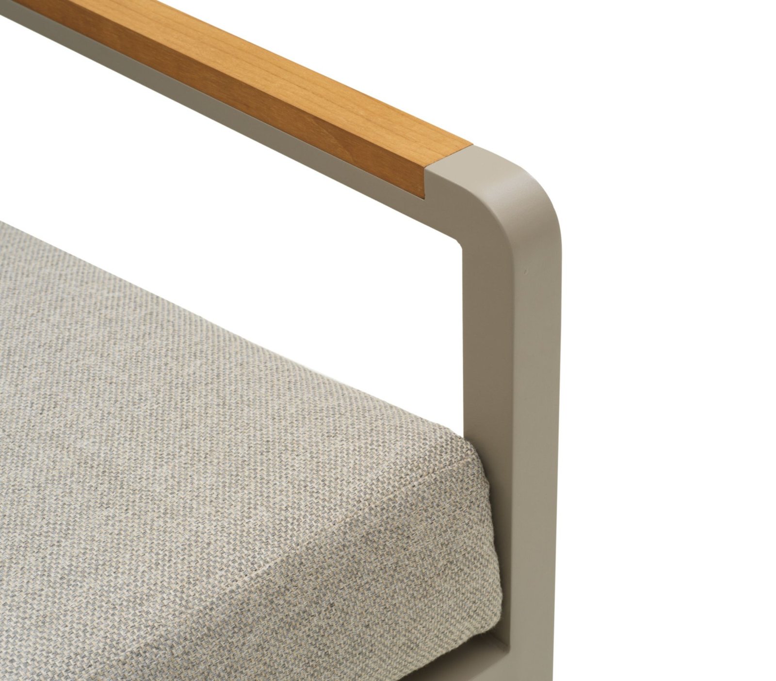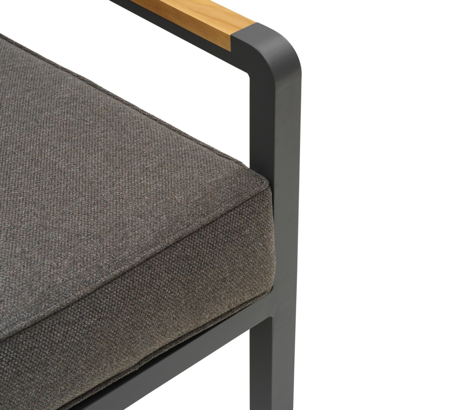Tvirtas aliuminio rėmas kartu su natūralaus tikmedžio porankiais sukuria elegantišką kontrastą ir suteikia baldams šilumos bei išskirtinumo.